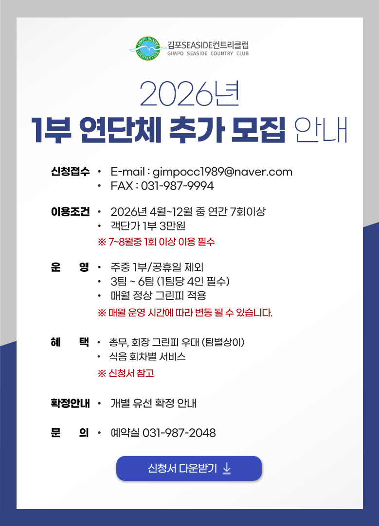 Home 정보마당 공지사항 공지사항 제목 2026년 1부 연단체 추가 모집 안내 작성자 관리자 작성일 2026.03.16 조회 409 첨부파일 다음 글 다음글이 없습니다. 이전 글 김포CC회원 king, Queen 골프데이 목록으로