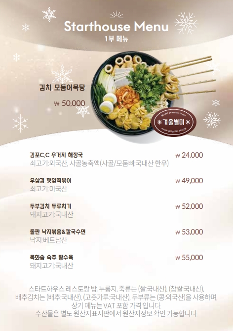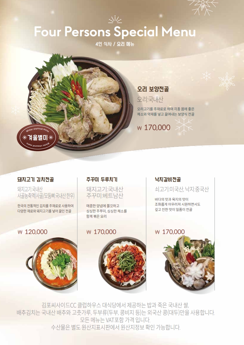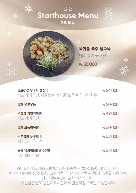 식 음 대식당 메뉴판 스타트 메뉴판 스타트 - 1부 스타트 - 2부 스타트 Beverage 레스토랑 조식 - 1人 레스토랑 중식 - 1人 레스토랑 중식 - 1人 레스토랑 전골류 - 4人 레스토랑 요리류 - 4人 << < 1 2 > >>