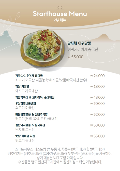 식 음 대식당 메뉴판 스타트 메뉴판 스타트 - 1부 스타트 - 2부 스타트 Beverage 레스토랑 조식 - 1人 레스토랑 중식 - 1人 레스토랑 중식 - 1人 레스토랑 전골류 - 4人 레스토랑 요리류 - 4人 << < 1 2 > >>